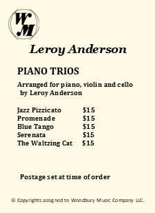 Publishing rights to the music of Leroy Anderson have been assigned to Woodbury Music Company LLC. Many early editions of his music including arrangements by others often include outdated information. Whether an older edition indicates that publishing copyright is held by Mills Music, Belwin Mills, CPP Belwin, EMI Belwin Mills or some other entity, the publishing right has been assigned to and is held by Woodbury Music Company LLC. To make an arrangement of a composition or arrangement by Leroy Anderson, contact Woodbury Music Company for permission.